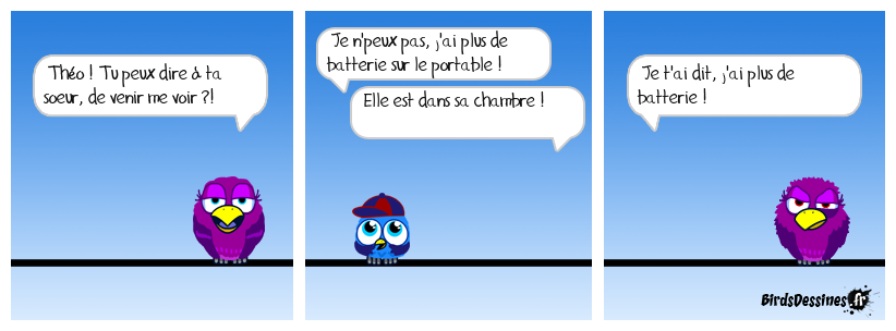 Case 1:Bird 1: Théo ! Tu peux dire à ta soeur, de venir me voir ?!Bird 2: Je n'peux pas, j'ai plus de batterie sur le portable ! | Case 2: Bird 1: Je n'peux pas, j'ai plus de batterie sur le portable ! Bird 2: Elle est dans sa chambre ! | Case 3: Bird 1: Je t'ai dit, j'ai plus de batterie !
