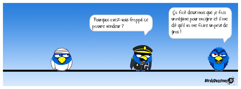 Case 1: | Case 2: Bird 1: Pourquoi avez-vous frappé ce pauvre vendeur ? | Case 3: Bird 1: Ça fait deux mois que je fais un régime pour maigrir et il me dit qu'il va me faire un prix de gros !