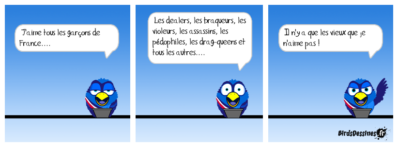 Case 1:Bird 1: J'aime tous les garçons de France.... | Case 2: Bird 1: Les dealers, les braqueurs, les violeurs, les assassins, les pédophiles, les drag-queens et tous les autres.... | Case 3: Bird 1: Il n'y a que les vieux que je n'aime pas !