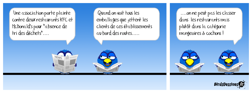 Case 1:Bird 1: Une association porte plainte contre deux restaurants KFC et McDonald's pour "absence de tri des déchets".... | Case 2: Bird 1: Quand on voit tous les emballages que jettent les clients de ces établissements au bord des routes..... | Case 3: Bird 1: ....on ne peut pas les classer dans les restaurants mais plutôt dans la catégorie mangeoires à cochons !