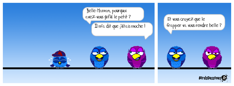 Case 1: | Case 2: Bird 1: Belle-Maman, pourquoi avez-vous giflé le petit ? Bird 2: Il m'a dit que j'étais moche ! | Case 3: Bird 1: Et vous croyez que le frapper va vous rendre belle ?