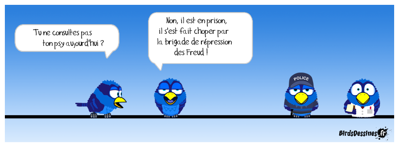 Case 1:Bird 1: Tu ne consultes pas ton psy aujourd'hui ? | Case 2: Bird 1: Non, il est en prison, il s'est fait choper par la brigade de répression des Freud ! | Case 3: