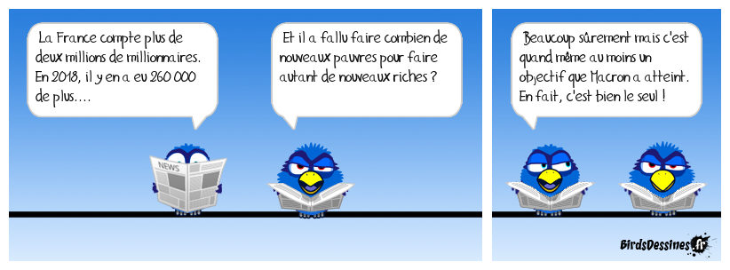 Case 1:Bird 1: La France compte plus de deux millions de millionnaires. En 2018, il y en a eu 260 000 de plus.... | Case 2: Bird 1: Et il a fallu faire combien de nouveaux pauvres pour faire autant de nouveaux riches ? | Case 3: Bird 1: Beaucoup sûrement mais c'est quand même au moins un objectif que Macron a atteint. En fait, c'est bien le seul !