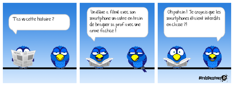 Case 1:Bird 1: T'as vu cette histoire ? | Case 2: Bird 1: Un élève a filmé avec son smartphone un autre en train de braquer sa prof avec une arme factice ! | Case 3: Bird 1: Oh putain ! Je croyais que les smartphones étaient interdits en classe ?!