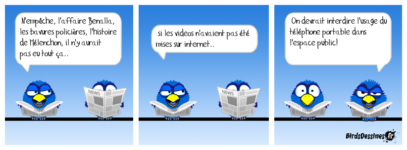 Case 1:Bird 1: N'empêche, l'affaire Benalla, les bavures policières, l'histoire de Mélenchon, il n'y aurait pas eu tout ça.. | Case 2: Bird 1: si les videos n'avaient pas été mises sur internet.. | Case 3: Bird 1: On devrait interdire l'usage du téléphone portable dans l'espace public!