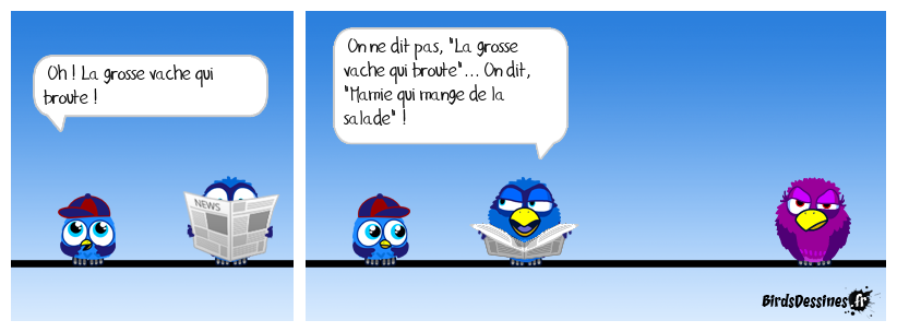 Case 1:Bird 1: Oh ! La grosse vache qui broute ! | Case 2: Bird 1: On ne dit pas, "La grosse vache qui broute"... On dit, "Mamie qui mange de la salade" ! | Case 3: