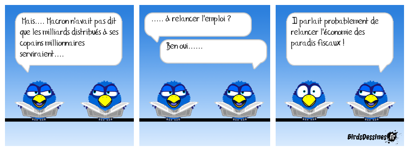 Case 1:Bird 1: Mais.... Macron n'avait pas dit que les milliards distribués à ses copains millionnaires serviraient.... | Case 2: Bird 1: ..... à relancer l'emploi ? Bird 2: Ben oui...... | Case 3: Bird 1: Il parlait probablement de relancer l'économie des paradis fiscaux !