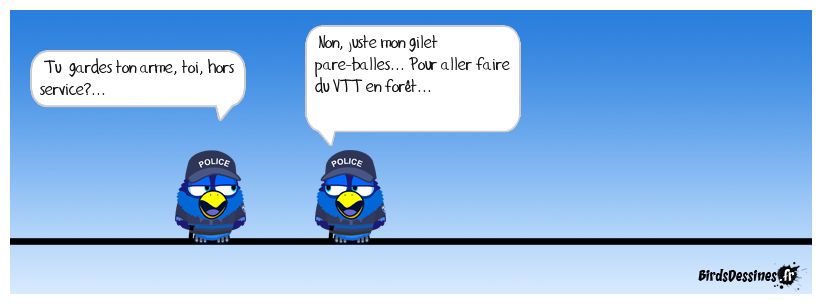 Case 1:Bird 1: Tu gardes ton arme, toi, hors service?... | Case 2: Bird 1: Non, juste mon gilet pare-balles... Pour aller faire du VTT en forêt... | Case 3: