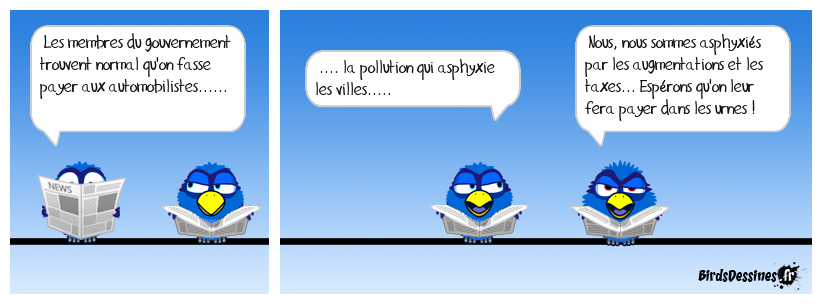 Case 1:Bird 1: Les membres du gouvernement trouvent normal qu'on fasse payer aux automobilistes...... | Case 2: Bird 1: .... la pollution qui asphyxie les villes..... | Case 3: Bird 1: Nous, nous sommes asphyxiés par les augmentations et les taxes... Espérons qu'on leur fera payer dans les urnes !