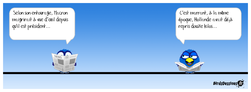 Case 1:Bird 1: Selon son entourage, Macron maigrirait à vue d’œil depuis qu'il est président... | Case 2: | Case 3: Bird 1: C'est marrant, à la même époque, Hollande avait déjà repris douze kilos...