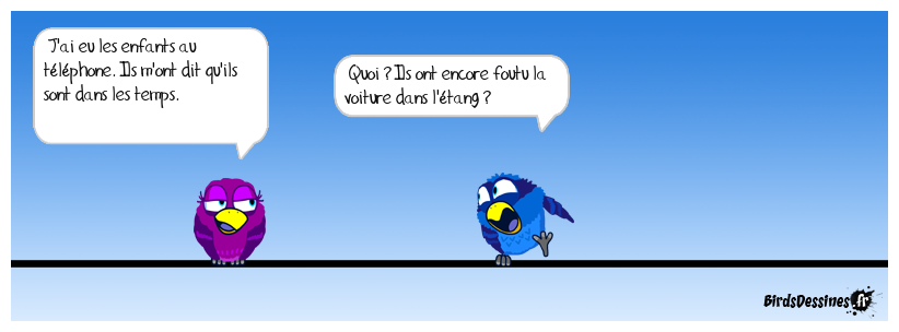 Case 1:Bird 1: J'ai eu les enfants au téléphone. Ils m'ont dit qu'ils sont dans les temps. | Case 2: Bird 1: Quoi ? Ils ont encore foutu la voiture dans l'étang ? | Case 3:
