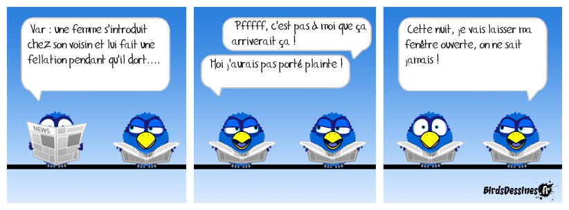 Case 1:Bird 1: Var : une femme s'introduit chez son voisin et lui fait une fellation pendant qu'il dort.... | Case 2: Bird 1: Pfffff, c'est pas à moi que ça arriverait ça ! Bird 2: Moi j'aurais pas porté plainte ! | Case 3: Bird 1: Cette nuit, je vais laisser ma fenêtre ouverte, on ne sait jamais !