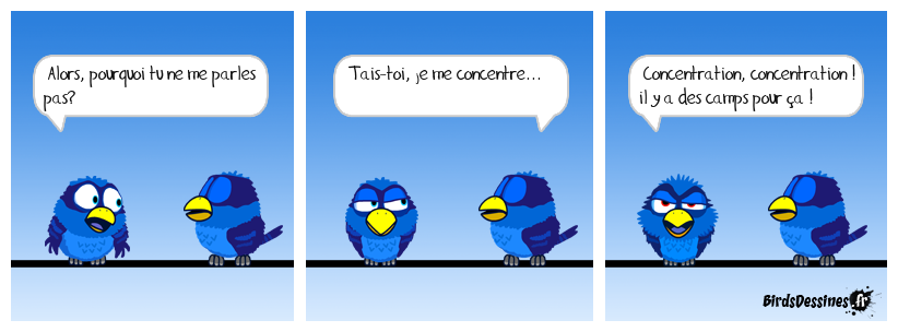 Case 1:Bird 1: Alors, pourquoi tu ne me parles pas? | Case 2: Bird 1: Tais-toi, je me concentre... | Case 3: Bird 1: Concentration, concentration ! il y a des camps pour ça !
