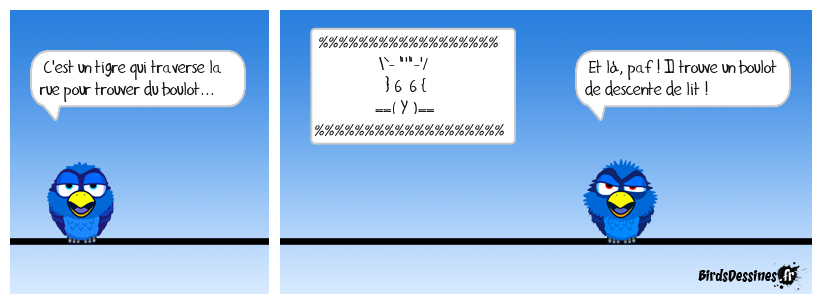 Case 1:Bird 1: C'est un tigre qui traverse la rue pour trouver du boulot... | Case 2: Bird 1: %%%%%%%%%%%%%%%%%% `- "'"-'/ } 6 6 { ==( Y )== %%%%%%%%%%%%%%%%%%% | Case 3: Bird 1: Et là, paf ! Il trouve un boulot de descente de lit !