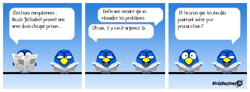 Case 1:Bird 1: Èlections européennes : Nicole Belloubet promet une urne dans chaque prison... | Case 2: Bird 1: Enfin une mesure qui va résoudre les problèmes d'incarcération ! Bird 2: Oh oui, il y avait urgence là. | Case 3: Bird 1: Et tu crois que les évadés pourront voter par procuration ?