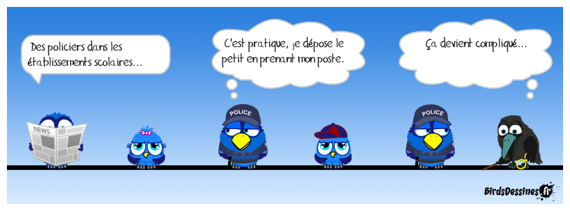Case 1:Bird 1: Des policiers dans les établissements scolaires... | Case 2: Bird 1: C'est pratique, je dépose le petit en prenant mon poste. | Case 3: Bird 1: Ça devient compliqué...