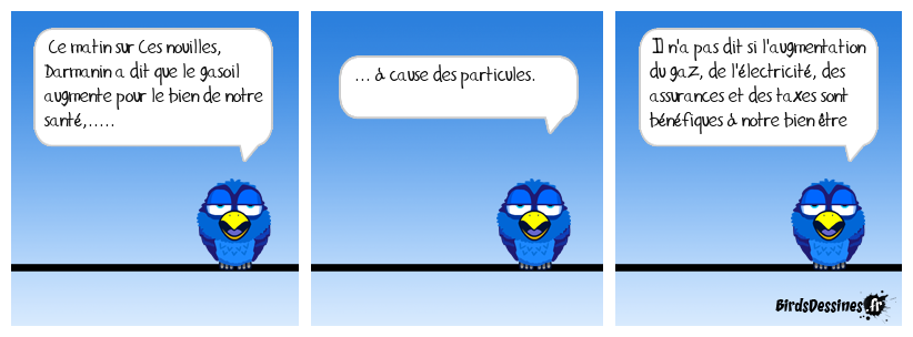 Case 1:Bird 1: Ce matin sur Ces nouilles, Darmanin a dit que le gasoil augmente pour le bien de notre santé,..... | Case 2: Bird 1: ... à cause des particules. | Case 3: Bird 1: Il n'a pas dit si l'augmentation du gaz, de l'électricité, des assurances et des taxes sont bénéfiques à notre bien être
