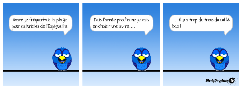 Case 1:Bird 1: Avant je fréquentais la plage pour naturistes de l'Espiguette | Case 2: Bird 1: Mais l'année prochaine je vais en choisir une autre.... | Case 3: Bird 1: ... il y a trop de trous du cul là bas !
