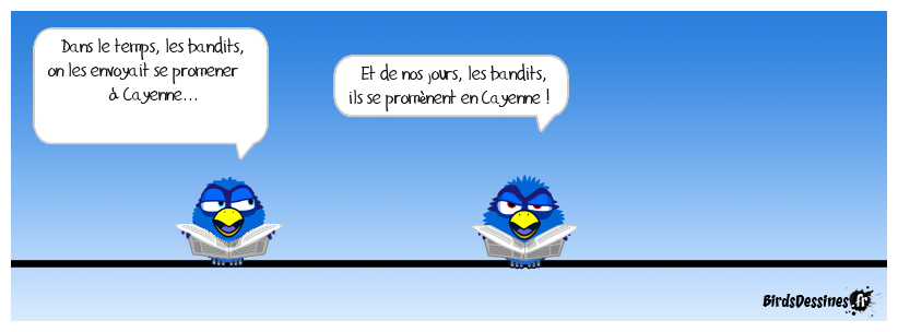 Case 1:Bird 1: Dans le temps, les bandits, on les envoyait se promener à Cayenne... | Case 2: Bird 1: Et de nos jours, les bandits, ils se promènent en Cayenne ! | Case 3: