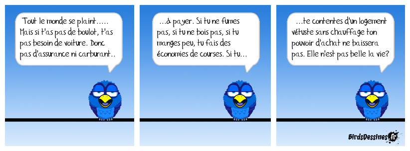 Case 1:Bird 1: Tout le monde se plaint..... Mais si t'as pas de boulot, t'as pas besoin de voiture. Donc pas d'assurance ni carburant.. | Case 2: Bird 1: ...à payer. Si tu ne fumes pas, si tu ne bois pas, si tu manges peu, tu fais des économies de courses. Si tu... | Case 3: Bird 1: ...te contentes d'un logement vétuste sans chauffage ton pouvoir d'achat ne baissera pas. Elle n'est pas belle la vie?