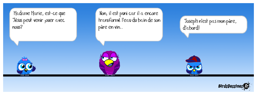 Case 1:Bird 1: Madame Marie, est-ce que Jésus peut venir jouer avec nous? | Case 2: Bird 1: Non, il est puni car il a encore transformé l'eau du bain de son père en vin.. | Case 3: Bird 1: Joseph n'est pas mon père, d'abord!