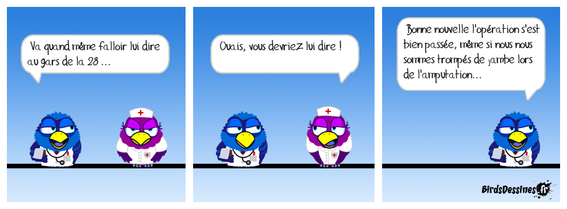 Case 1:Bird 1: Va quand même falloir lui dire au gars de la 28 ... | Case 2: Bird 1: Ouais, vous devriez lui dire ! | Case 3: Bird 1: Bonne nouvelle l'opération s'est bien passée, même si nous nous sommes trompés de jambe lors de l'amputation...