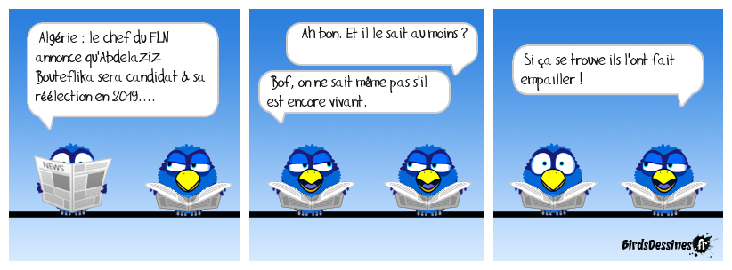 Case 1:Bird 1: Algérie : le chef du FLN annonce qu'Abdelaziz Bouteflika sera candidat à sa réélection en 2019.... | Case 2: Bird 1: Ah bon. Et il le sait au moins ? Bird 2: Bof, on ne sait même pas s'il est encore vivant. | Case 3: Bird 1: Si ça se trouve ils l'ont fait empailler !