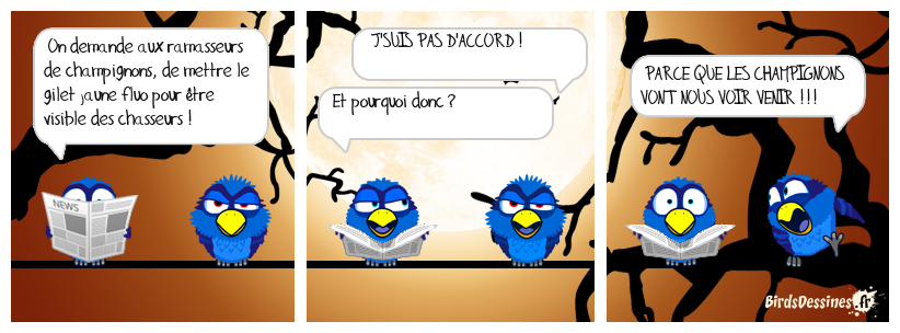 Case 1:Bird 1: On demande aux ramasseurs de champignons, de mettre le gilet jaune fluo pour être visible des chasseurs ! | Case 2: Bird 1: J'SUIS PAS D'ACCORD ! Bird 2: Et pourquoi donc ? | Case 3: Bird 1: PARCE QUE LES CHAMPIGNONS VONT NOUS VOIR VENIR !!!