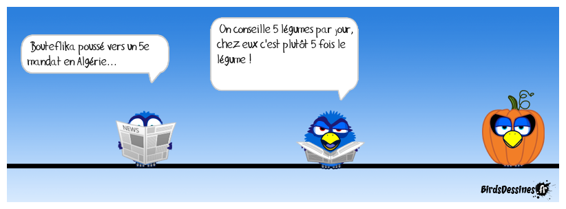 Case 1:Bird 1: Bouteflika poussé vers un 5e mandat en Algérie... | Case 2: Bird 1: On conseille 5 légumes par jour, chez eux c'est plutôt 5 fois le légume ! | Case 3:
