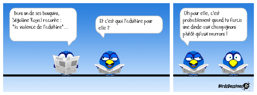 Case 1:Bird 1: Dans un de ses bouquins, Ségolène Royal raconte : "la violence de l'adultère"... | Case 2: Bird 1: Et c'est quoi l'adultère pour elle ? | Case 3: Bird 1: Oh pour elle, c'est probablement quand tu farcis une dinde aux champignons plutôt qu'aux marrons !