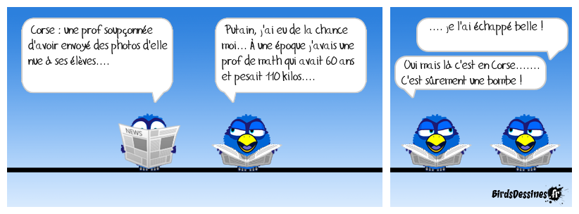 Case 1:Bird 1: Corse : une prof soupçonnée d'avoir envoyé des photos d'elle nue à ses élèves.... | Case 2: Bird 1: Putain, j'ai eu de la chance moi... À une époque j'avais une prof de math qui avait 60 ans et pesait 110 kilos.... | Case 3: Bird 1: .... je l'ai échappé belle ! Bird 2: Oui mais là c'est en Corse....... C'est sûrement une bombe !