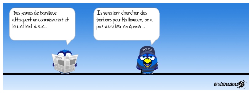 Case 1:Bird 1: Des jeunes de banlieue attaquent un commissariat et le mettent à sac.. | Case 2: Bird 1: Ils venaient chercher des bonbons pour Halloween, on a pas voulu leur en donner.. | Case 3:
