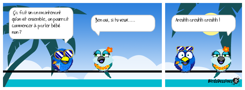 Case 1:Bird 1: Ça fait un an maintenant qu'on vit ensemble, on pourrait commencer à parler bébé non ? | Case 2: Bird 1: Ben oui, si tu veux..... | Case 3: Bird 1: Areuhh areuhh areuhh !