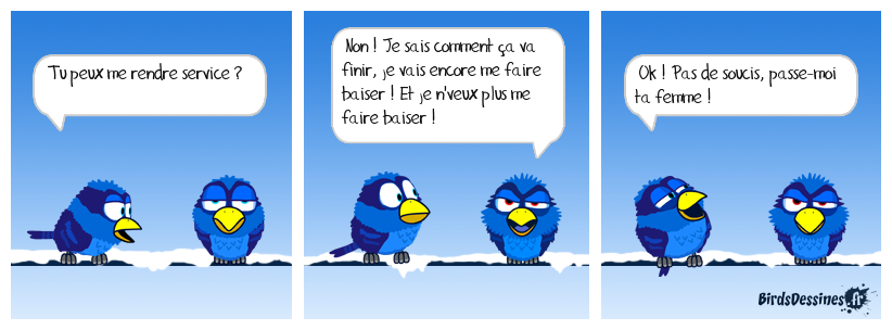 Case 1:Bird 1: Tu peux me rendre service ? | Case 2: Bird 1: Non ! Je sais comment ça va finir, je vais encore me faire baiser ! Et je n'veux plus me faire baiser ! | Case 3: Bird 1: Ok ! Pas de soucis, passe-moi ta femme !