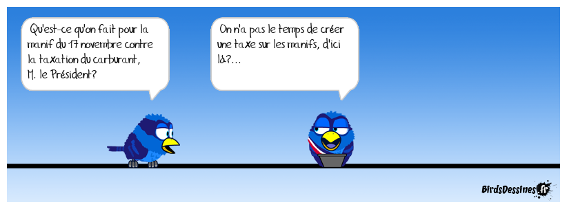 Case 1:Bird 1: Qu'est-ce qu'on fait pour la manif du 17 novembre contre la taxation du carburant, M. le Président? | Case 2: Bird 1: On n'a pas le temps de créer une taxe sur les manifs, d'ici là?... | Case 3: