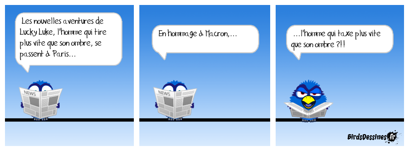 Case 1:Bird 1: Les nouvelles aventures de Lucky Luke, l'homme qui tire plus vite que son ombre, se passent à Paris... | Case 2: Bird 1: En hommage à Macron,... | Case 3: Bird 1: ...l'homme qui taxe plus vite que son ombre ?!!