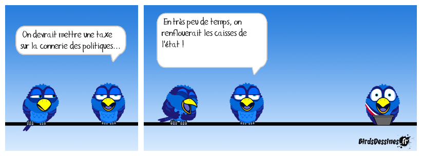 Case 1:Bird 1: On devrait mettre une taxe sur la connerie des politiques... | Case 2: Bird 1: En très peu de temps, on renflouerait les caisses de l'état ! | Case 3: