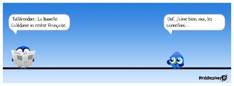 Case 1:Bird 1: Référendum : La Nouvelle Calédonie va rester française. | Case 2: | Case 3: Bird 1: Ouf, j'aime bien, moi, les cannelloni...
