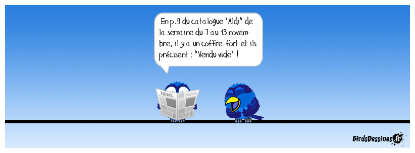 Case 1: | Case 2: Bird 1: En p.9 du catalogue "Aldi" de la semaine du 7 au 13 novem- bre, il y a un coffre-fort et ils précisent : "Vendu vide" ! | Case 3: