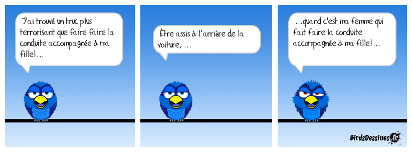 Case 1:Bird 1: J'ai trouvé un truc plus terrorisant que faire faire la conduite accompagnée à ma fille!... | Case 2: Bird 1: Être assis à l’arrière de la voiture, ... | Case 3: Bird 1: ...quand c'est ma femme qui fait faire la conduite accompagnée à ma fille!...