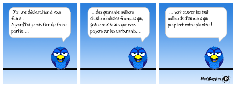 Case 1:Bird 1: J'ai une déclaration à vous faire : Aujourd'hui je suis fier de faire partie.... | Case 2: Bird 1: ...des quarante millions d'automobilistes français qui, grâce aux taxes que nous payons sur les carburants.... | Case 3: Bird 1: ... vont sauver les huit milliards d'humains qui peuplent notre planète !