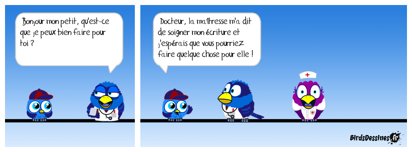 Case 1:Bird 1: Bonjour mon petit, qu'est-ce que je peux bien faire pour toi ? | Case 2: Bird 1: Docteur, la maïtresse m'a dit de soigner mon écriture et j'espérais que vous pourriez faire quelque chose pour elle ! | Case 3:
