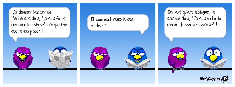 Case 1:Bird 1: Ça devient lassant de t'entendre dire, "je vais faire cracher le colosse" chaque fois que tu vas pisser ! | Case 2: Bird 1: Et comment veux-tu que je dise ? | Case 3: Bird 1: En tant qu'archéologue, tu devrais dire, "Je vais sortir la momie de son sarcophage" !