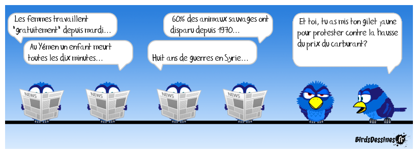 Case 1:Bird 1: Les femmes travaillent "gratuitement" depuis mardi...Bird 2: Au Yémen un enfant meurt toutes les dix minutes... | Case 2: Bird 1: 60% des animaux sauvages ont disparu depuis 1970... Bird 2: Huit ans de guerres en Syrie... | Case 3: Bird 1: Et toi, tu as mis ton gilet jaune pour protester contre la hausse du prix du carburant?