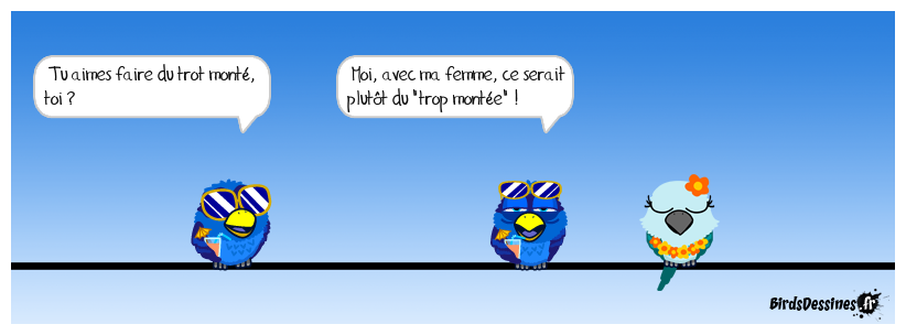Case 1:Bird 1: Tu aimes faire du trot monté, toi ? | Case 2: Bird 1: Moi, avec ma femme, ce serait plutôt du "trop montée" ! | Case 3: