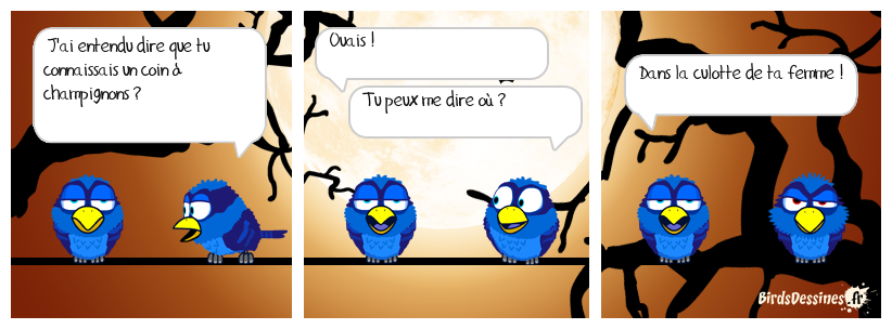 Case 1:Bird 1: J'ai entendu dire que tu connaissais un coin à champignons ? | Case 2: Bird 1: Ouais ! Bird 2: Tu peux me dire où ? | Case 3: Bird 1: Dans la culotte de ta femme !