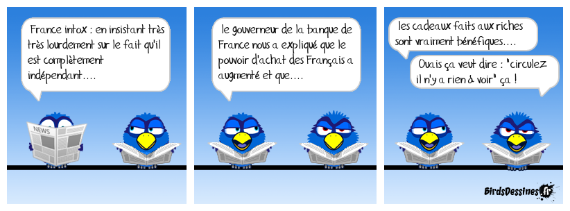 Case 1:Bird 1: France intox : en insistant très très lourdement sur le fait qu'il est complètement indépendant.... | Case 2: Bird 1: le gouverneur de la banque de France nous a expliqué que le pouvoir d'achat des Français a augmenté et que.... | Case 3: Bird 1: les cadeaux faits aux riches sont vraiment bénéfiques.... Bird 2: Ouais ça veut dire : "circulez il n'y a rien à voir" ça !