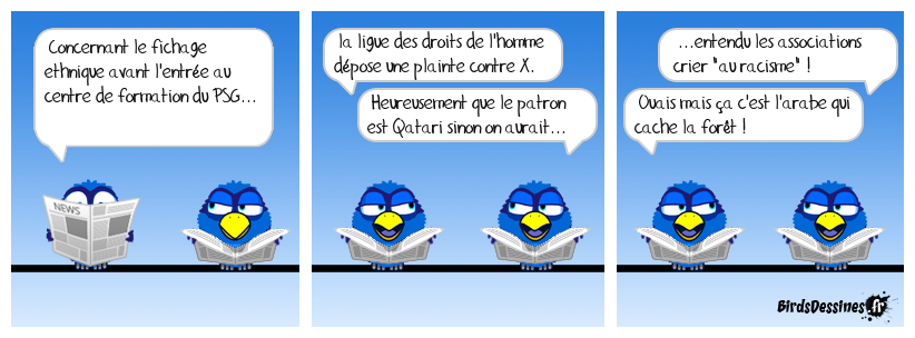 Case 1:Bird 1: Concernant le fichage ethnique avant l'entrée au centre de formation du PSG... | Case 2: Bird 1: la ligue des droits de l'homme dépose une plainte contre X. Bird 2: Heureusement que le patron est Qatari sinon on aurait... | Case 3: Bird 1: ...entendu les associations crier "au racisme" ! Bird 2: Ouais mais ça c'est l'arabe qui cache la forêt !