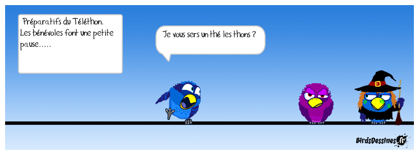 Case 1:Bird 1: Préparatifs du Téléthon. Les bénévoles font une petite pause..... | Case 2: Bird 1: Je vous sers un thé les thons ? | Case 3: