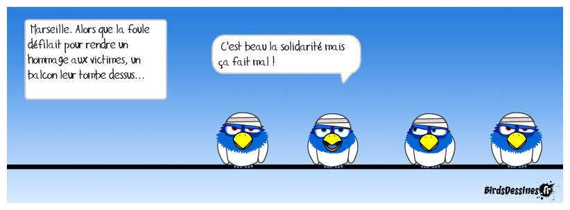 Case 1:Bird 1: Marseille. Alors que la foule défilait pour rendre un hommage aux victimes, un balcon leur tombe dessus... | Case 2: Bird 1: C'est beau la solidarité mais ça fait mal ! | Case 3: